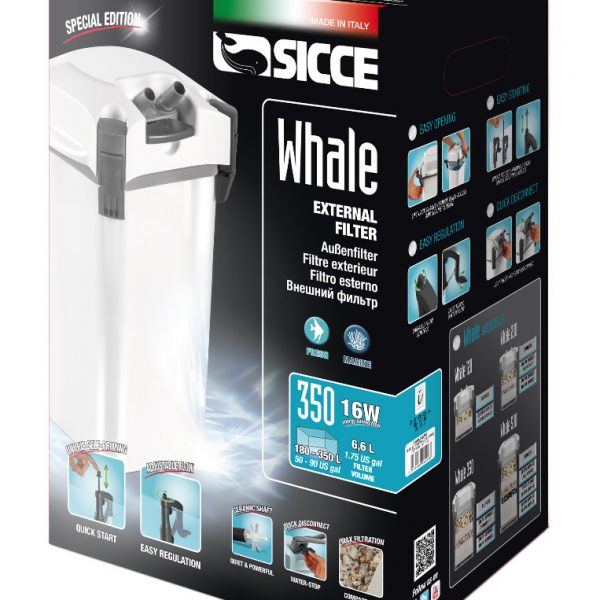 Los filtros externos WHALE se distinguen por su diseño y acabados refinados. Son particularmente adecuados para entornos modernos donde el gusto estético también se convierte en un requisito clave para elegir el producto. La tranquilidad, la filtración eficiente, el bajo consumo de energía y las soluciones técnicas diseñadas para facilitar el uso y el mantenimiento, caracterizan esta línea de filtros que consta de 4 modelos para su uso en acuarios pequeños, medianos y grandes.